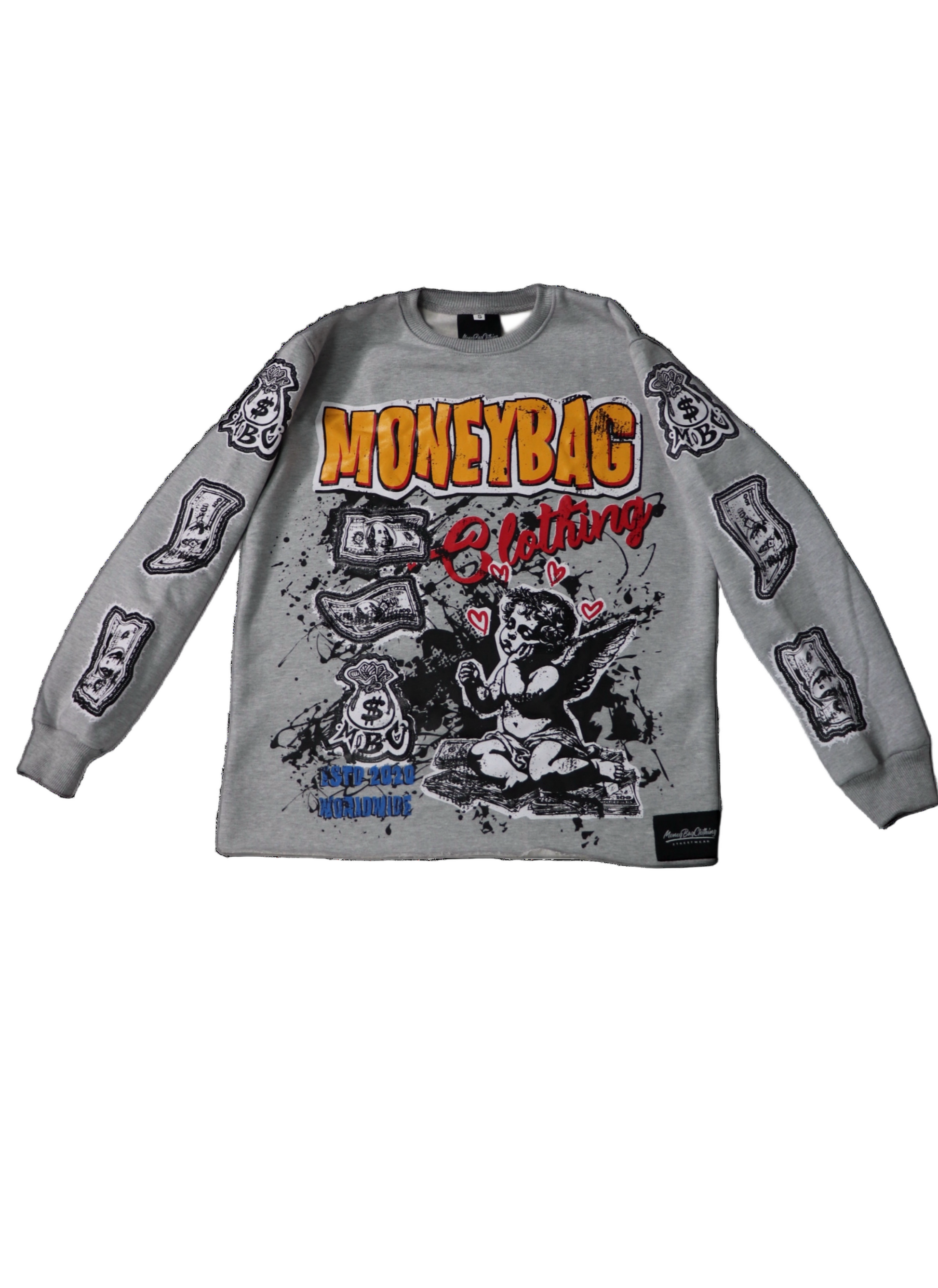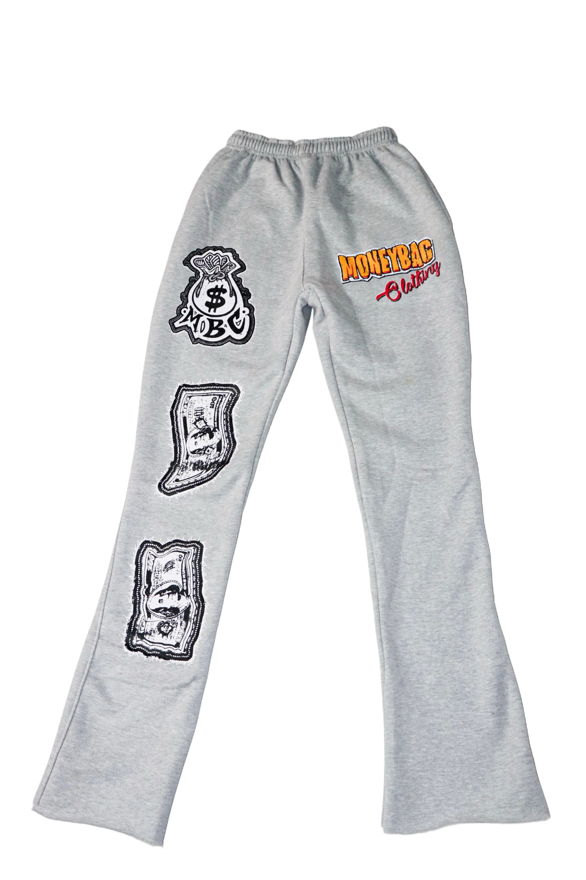 our Money Bag Set. Crafted from premium 100% cotton, this sweatsuit set includes a no trim crewneck sweater and flair pants, adorned with a sleek screen print design from money bag clothing. With comfort and style in one, feel confident and powerful in our exclusive set.